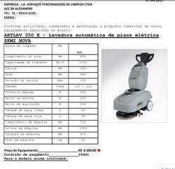Máquina elétrica lavadora de piso, marca/modelo artlav 350e, semi nova, com suporte para escova de lavar, com rodo de sucção, 220v, com cabo de energis elétrica, com um tanque de água limpa e um tanque de água suja, em perfeito estado de conservação e uso, número de série 3344.13.